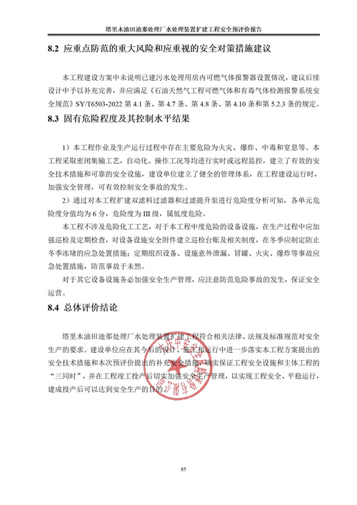 塔里木油田迪那處理廠水處理裝置擴建工程符合相關法律、法規(guī)及標準規(guī)范對安全生產(chǎn)的要求。建設單位應在其今后的設計、施工和運行中進一步落實本工程方案提出的安全技術(shù)措施和本次預評價提出的補充安全措施,確實保證工程安全設施和主體工程的“三同時”,并在工程竣工投產(chǎn)后切實加強安全生產(chǎn)管理,以實現(xiàn)工程安全、平穩(wěn)運行,建成投產(chǎn)后可以達到安全生產(chǎn)的目的。 |