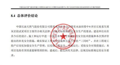 中國石油天然氣股份有限公司塔里木油田分公司塔里木油田塔中6井區石炭系生屑灰巖段試采項目方案符合相關法律、法規及標準規范對安全生產的要求。建設單位應在其今后的設計、施工和運行中進一步落實本工程方案提出的安全技術措施和本次預評價提出的補充安全措施,確實保證工程安全設施和主體工程的“三同時”,并在工程竣工投產后切實加強安全生產管理,以實現工程安全、平穩運行,采取安全對策措施后,本項目危險有害因素能夠得到控制,建成后,能達到有關法律、法規及標準規定的安全要求。 |