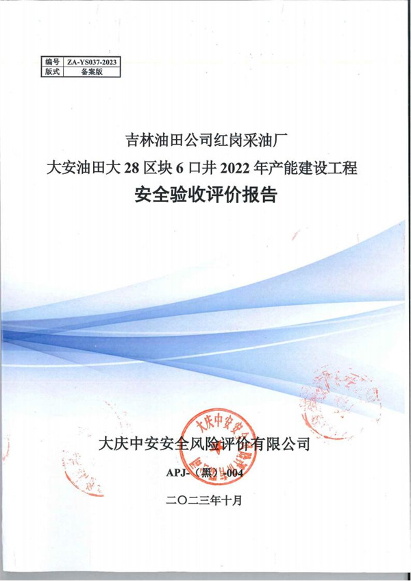 吉林油田公司紅崗采油廠大安油田大28區(qū)塊6口井2022年產(chǎn)能建設(shè)工程安全驗(yàn)收評(píng)價(jià) |