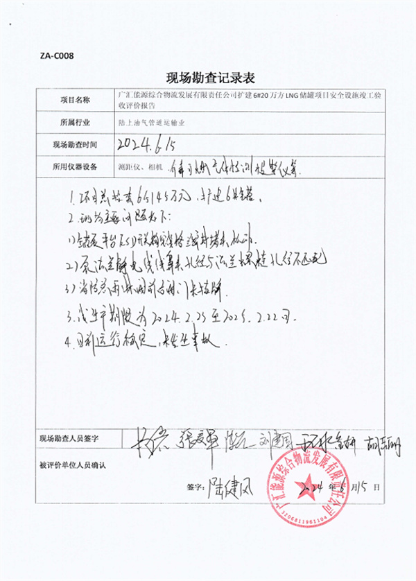 廣匯能源綜合物流發展有限責任公司擴建6#20萬m3LNG儲罐項目安全設施竣工驗收評價報告 |
