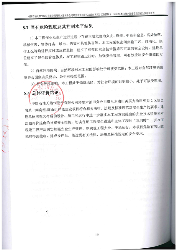 中國石油天然氣股份有限公司塔里木油田分公司塔里木油田英買力油田英買2區(qū)塊奧陶系一間房組-鷹山組產(chǎn)能建設(shè)項目符合相關(guān)法律、法規(guī)及標準規(guī)范對安全生產(chǎn)的要求。建設(shè)單位應(yīng)在其今后的設(shè)計、施工和運行中進一步落實本工程方案提出的安全技術(shù)措施和本次預評價提出的補充安全措施,切實保證工程安全設(shè)施和主體工程的“三同時”,并在工程竣工投產(chǎn)后切實加強安全生產(chǎn)管理,以實現(xiàn)工程安全、平穩(wěn)運行,本項目危險有害因素能夠得到控制,建成投產(chǎn)后,能達到有關(guān)法律、法規(guī)及標準規(guī)定的安全要求。 |