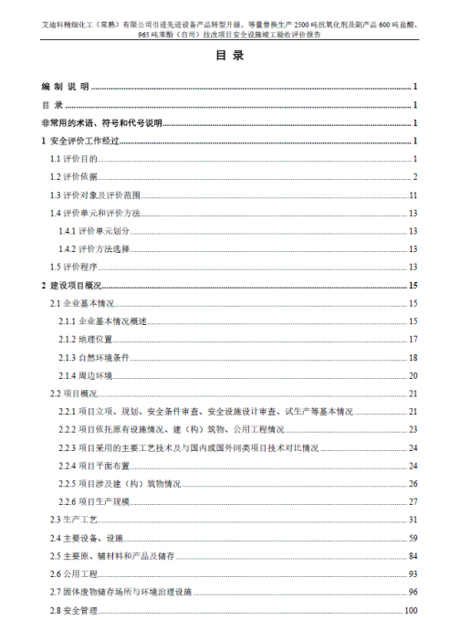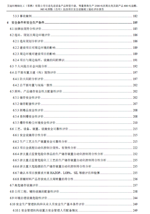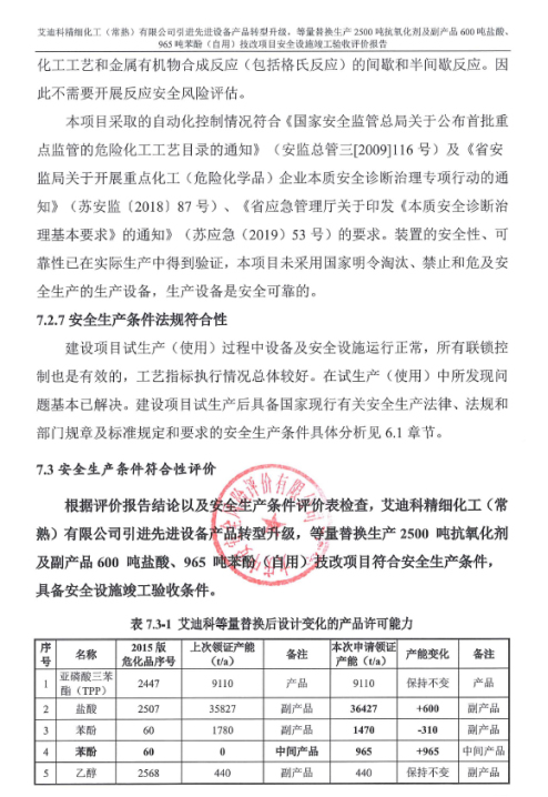 艾迪科精細化工(常熟)有限公司引進先進設(shè)備產(chǎn)品轉(zhuǎn)型升級,等量替換生產(chǎn)2500 噸抗氧化劑及副產(chǎn)品600 噸鹽酸、965 噸苯酚(自用)技改項目符合安全生產(chǎn)條件,具備安全設(shè)施竣工驗收條件。