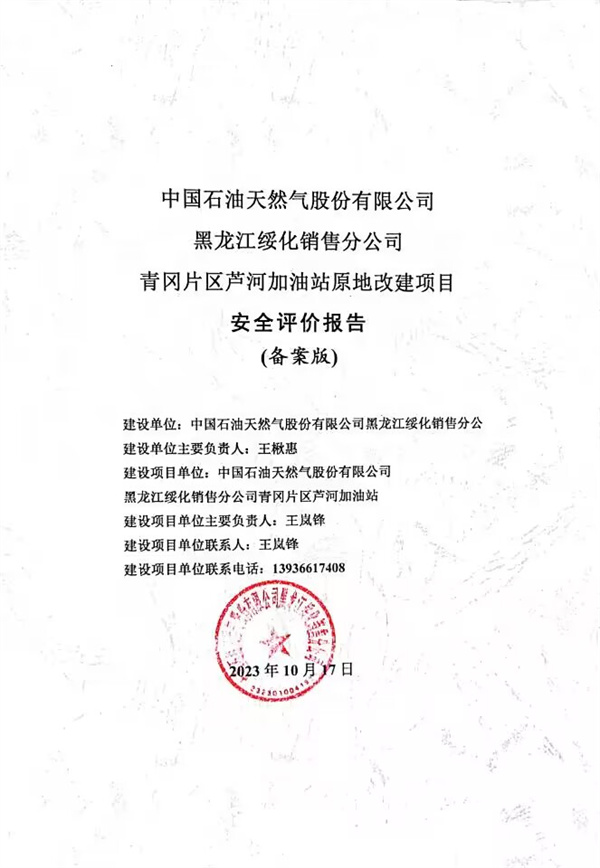 中國石油天然氣股份有限公司黑龍江綏化銷售分公司青岡片區蘆河加油站原地改建項目安全預評價 |