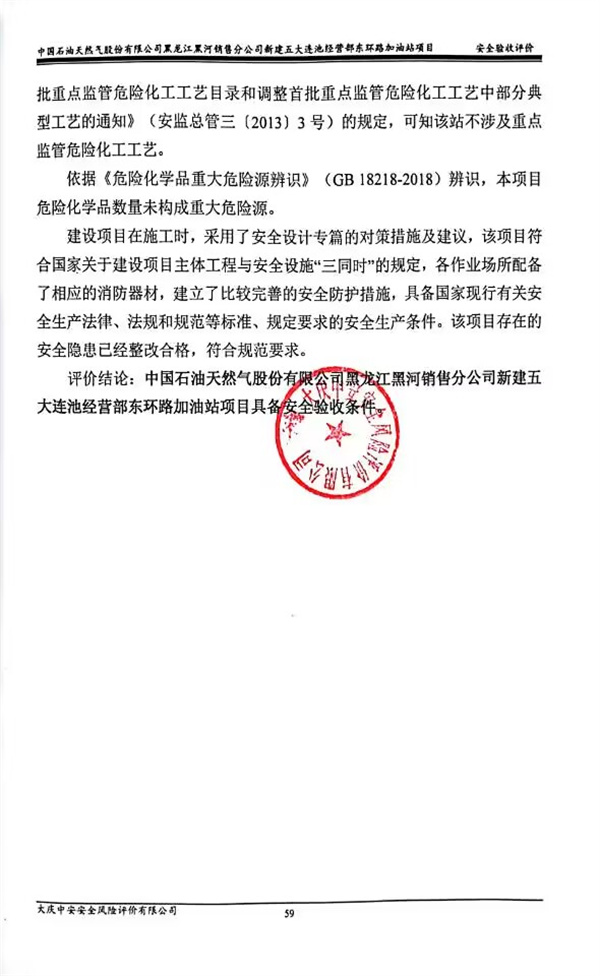 中國石油天然氣股份有限公司黑龍江黑河銷售分公司新建五大連池經營部東環路 加油站項目安全驗收評價