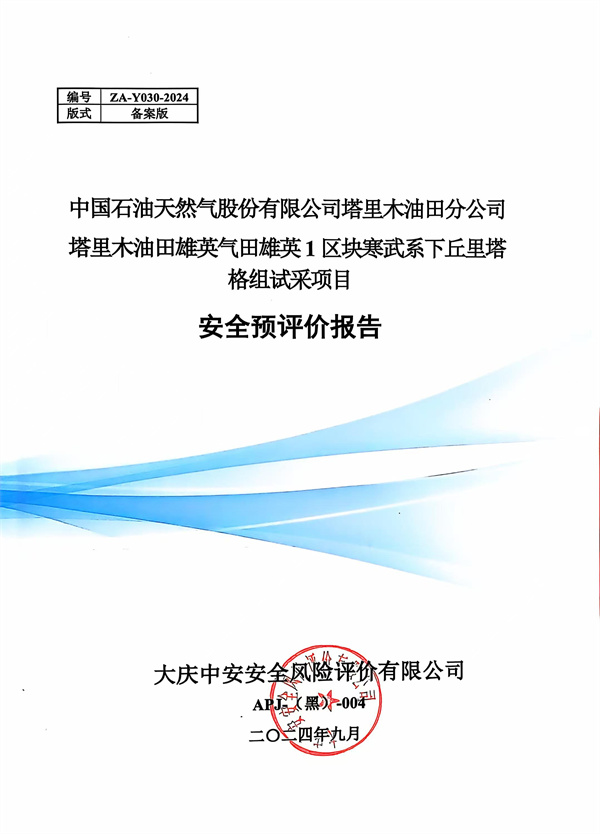 中國石油天然氣股份有限公司塔里木油田分公司塔里木油田雄英氣田雄英1區塊寒武系下丘里塔格組試采項目安全預評價